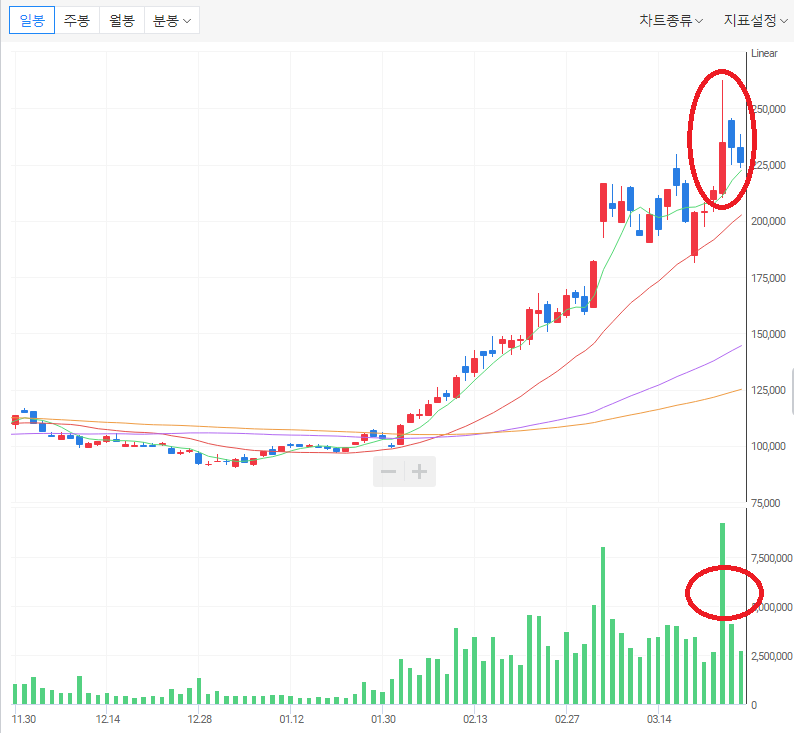 삼성전자는 대량 거래 후에 고점이 나타났으며, 최근에 상승 추세에 있는 에코프로비엠도 대량 거래량이 나타나서 고점일 확률이 높다.