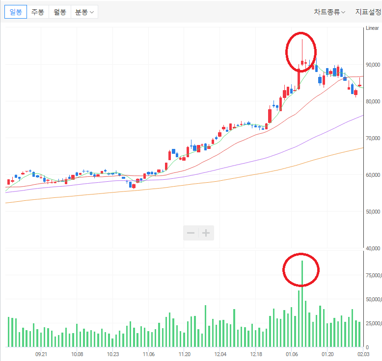 주가가 고점을 갱신하면서 상승하다가 최대 거래량이 발생하게 된다면 세력들이 이탈했을 가능성이 높다.