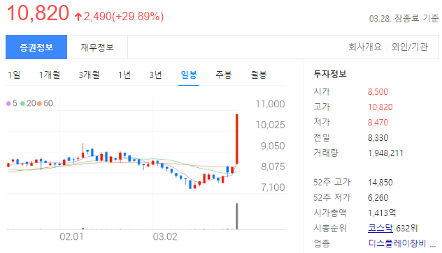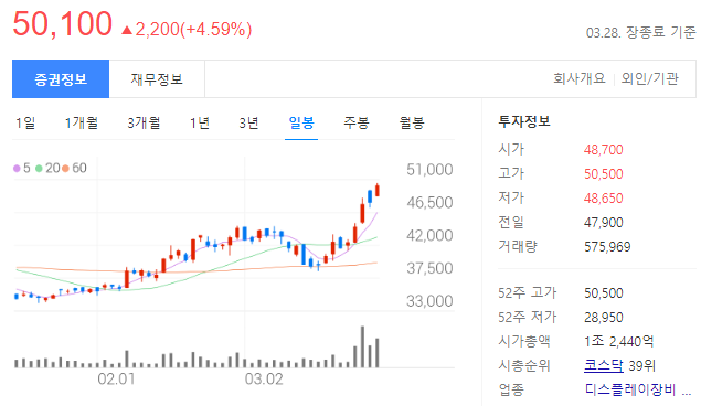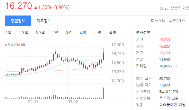 - 디스플레이 패널을 구동하는 핵심부품을 생산, 판매하는 사업을 영위하고 있으며, LG그룹에 속해 있어서 주가는 LG디스플레이와 비슷한 면모를 보인다.