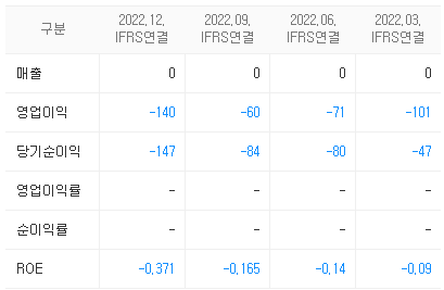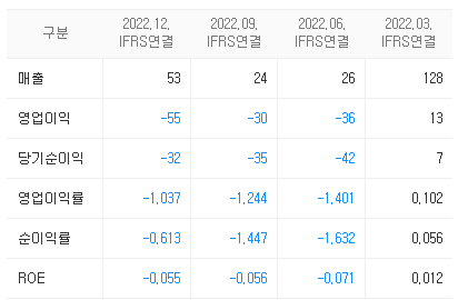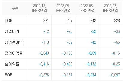 - 판관비, 인건비, 이자비용 등이 상승하여 영업이익이 감소하고 있고 적자를 기록 중이다.