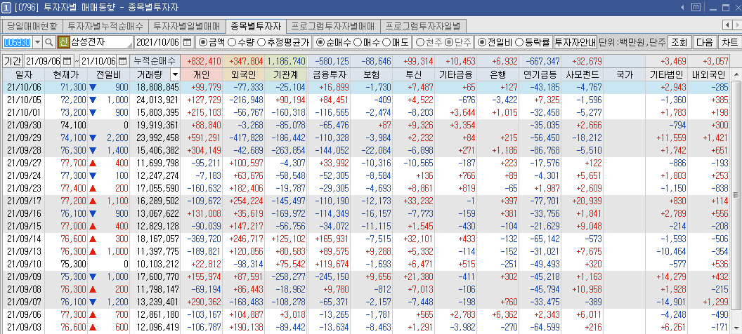 9월 28일부터 10월 6일까지 개인들이 1조 4,260억 원을 순매수하고 있으며, 외국인과 기관은 각각 8,141억 원, 6,305억 원을 순매도하고 있다.