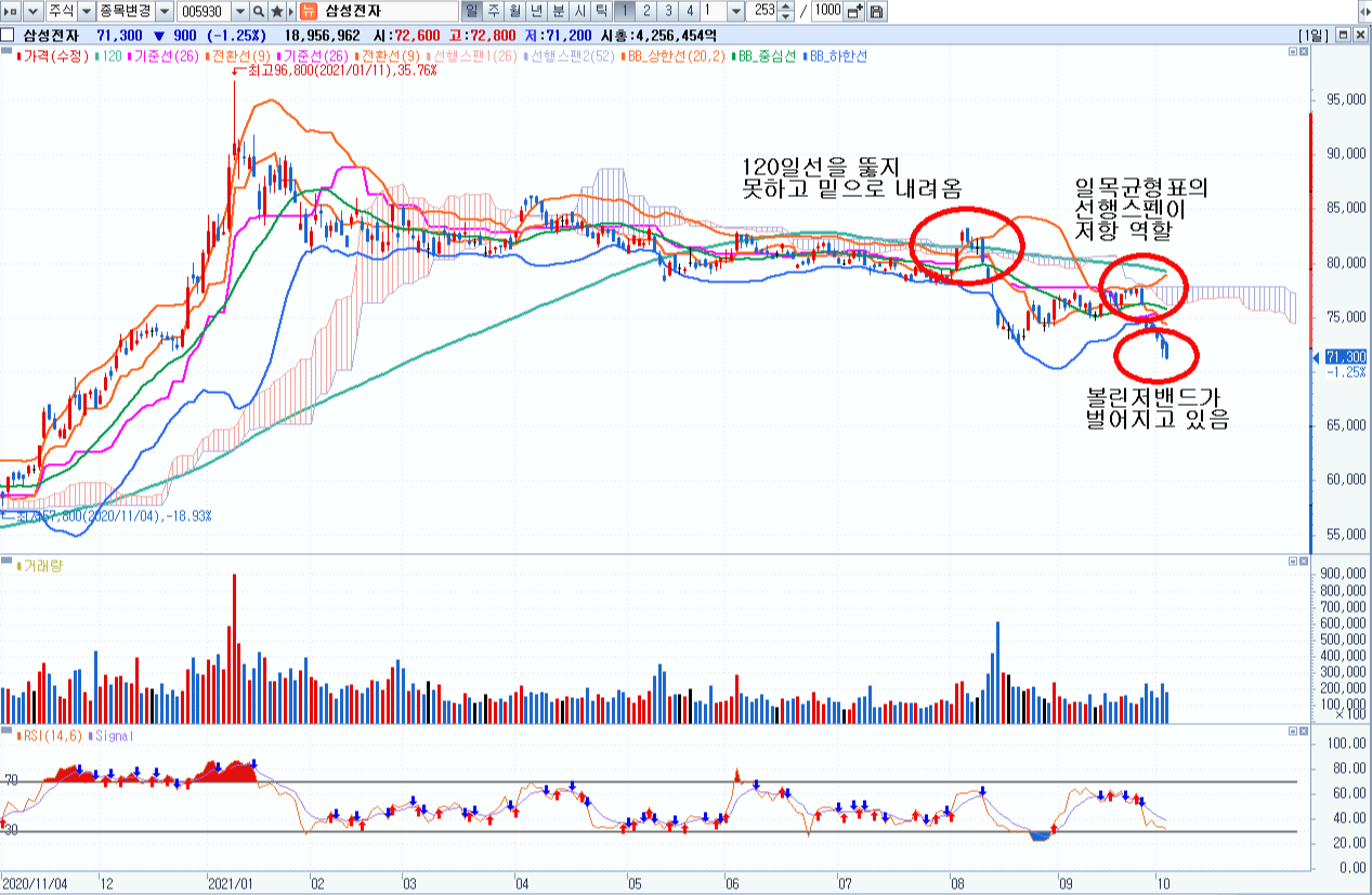 ㄹ) RSI가 하향 추세를 보이고 있다.