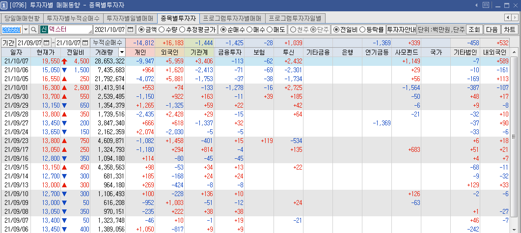 오늘 상한가를 기록하면서 개인들은 매도하였고 외국인과 기관은 매수를 하였다.
