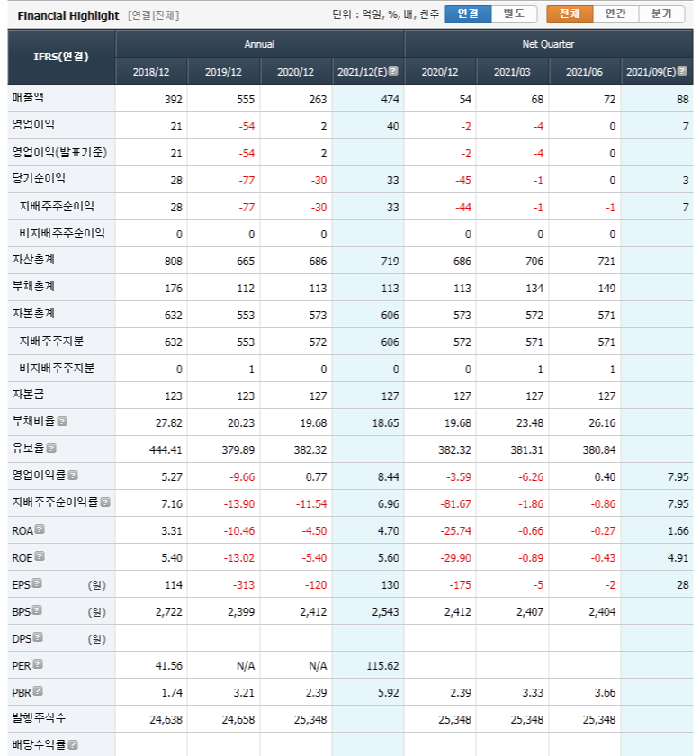 2021년에 실적이 증가하고 있는 추세이다. 당기순이익은 흑자로 전환될 예상이다.