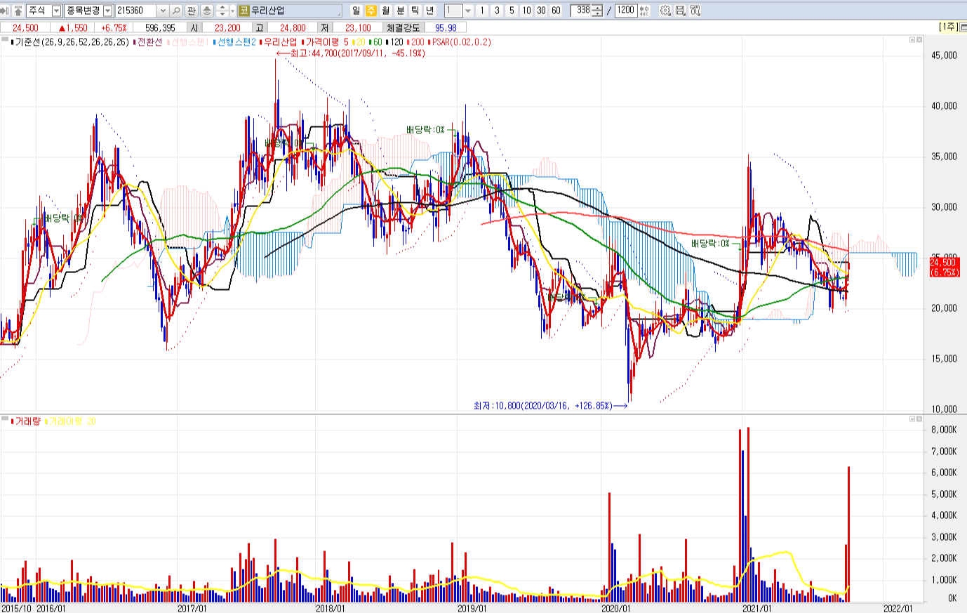 a) 대량의 거래량을 동반하며 상승하였다.