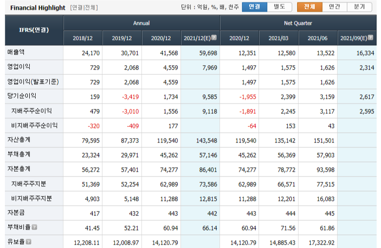 ㄱ) 2021년 6월 전년 동기 대비 연결기준 매출액, 영업이익, 당기순이익은 각각 43.3%, 72.1%, 146.8% 증가하였다.