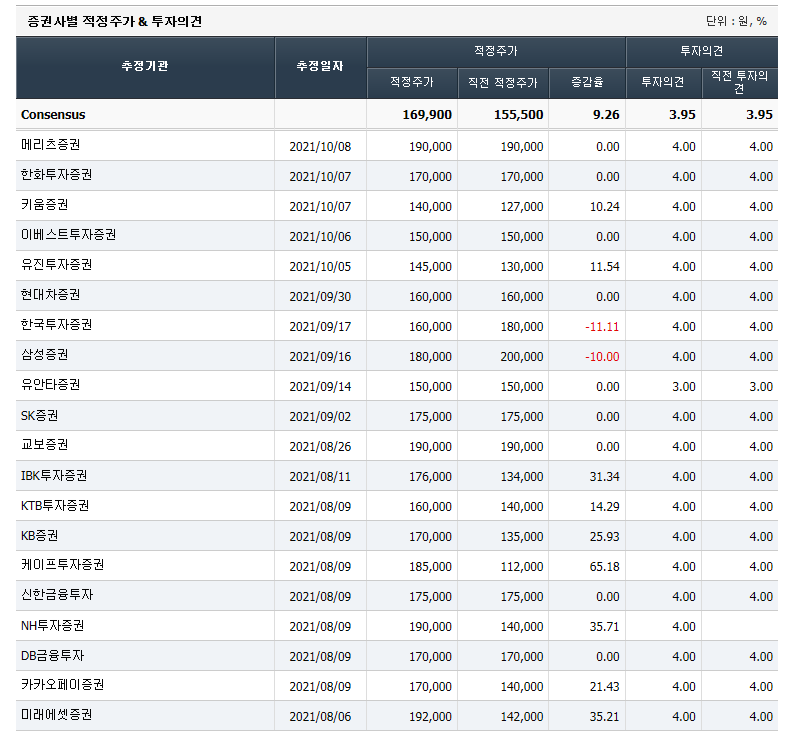 8월에는 주가를 상향하는 리포트를 발행했지만 9월과 10월에는 평균적으로 약 17만 원 정도의 목표 주가를 제시했다.