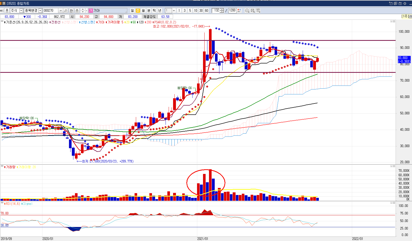 내연기관에서 친환경 자동차로 탈바꿈하려는 기아의 미래 주가는 밝다. 하지만 단기적으로 9.5만 원 부분에서 7.5만 원 부분까지의 박스권이 예상된다. 최고점 10.2만 원을 뚫기에는 다소 시간이 걸릴 것으로 판단된다. 박스권 상단에서의 매매는 주의가 필요하다.