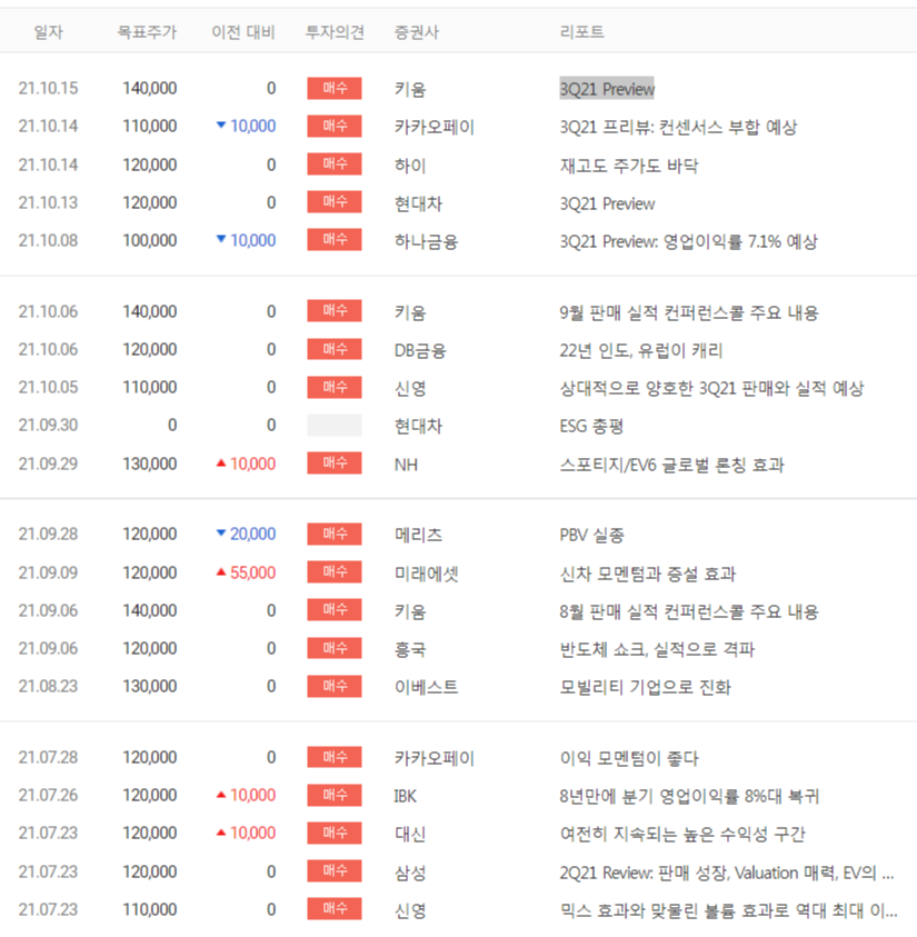 자동차 반도체의 공급 부족으로 인하여 생산이 원활하게 이루어지지 못해서 판매가 예상치를 하회할 것이라는 리포트가 대부분이고 목표주가는 약보합이다.