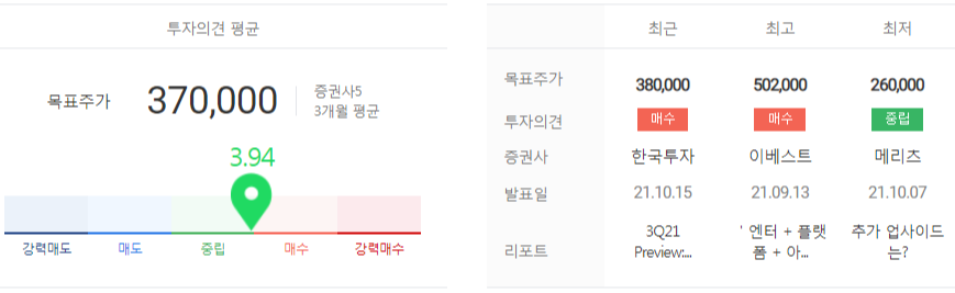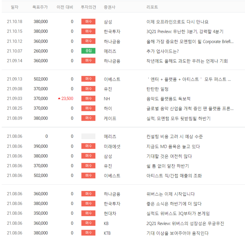대부분의 증권사들이 매수를 유지했다. 최근 발행한 리포트에서는 4분기부터는 공연 재개 수혜가 가장 큰 엔터사로서 확실한 실적을 예고했다.