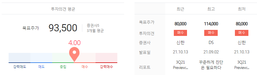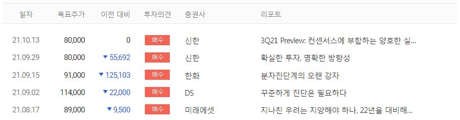 8월부터 증권사 리포트의 목표주가는 이전 대비하여 하락하였으나 투자의견은 매수를 유지하고 있다.