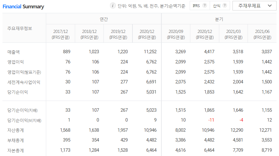 씨젠은 분자진단 전문기업으로 성장하였고 이러한 의학 기술은 코로나19 진단키트를 누구보다도 발 빠르게 개발할 수 있었다. 아마도 코로나19 진단 검사를 한 번이라도 안 받아본 사람은 없을 것이다. 이러한 시대의 흐름을 타고 2020년 매출액 1.1조 원, 영업이익 6,752억 원으로 2019년 대비 각각 약 10배, 30배의 괄목할만한 성장을 했다. 실적의 증가에 따라서 주가도 고공행진을 보였다. 1만 원 하던 주가가 16.2만 원까지 1년 만에 상승했다.