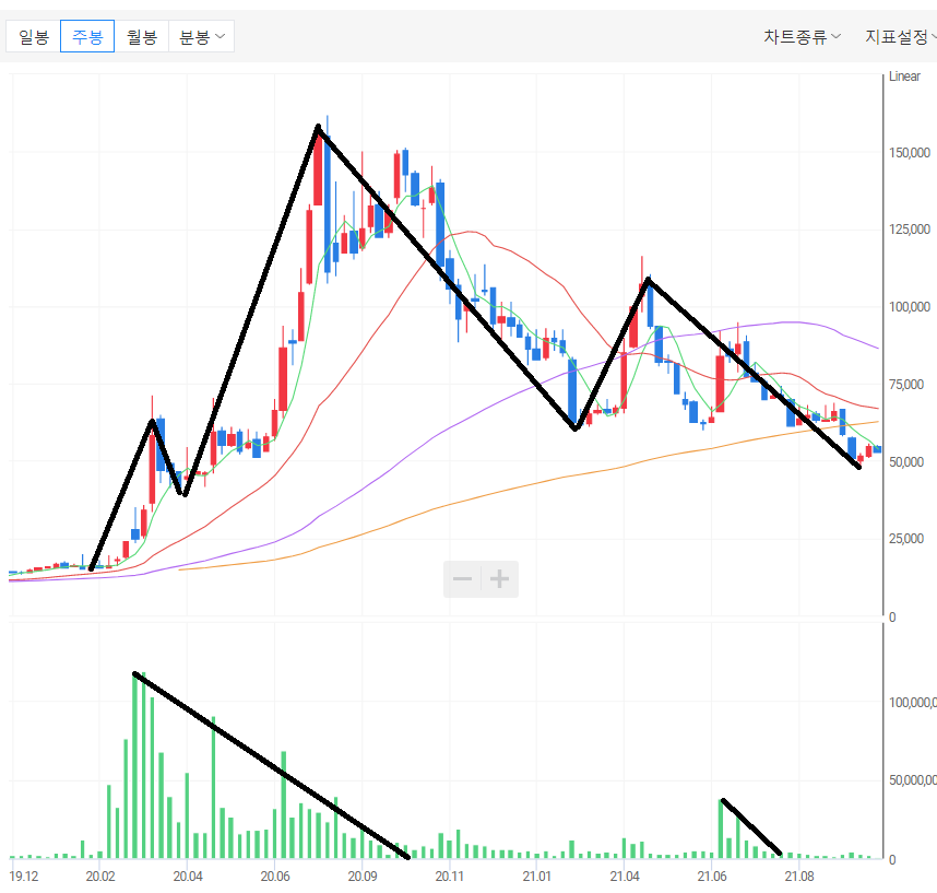 ㄴ) 거래량이 큰 폭으로 줄어들고 있다. 이전 만큼만의 거래량 없이는 상승은 힘들다고 할 수 있다.