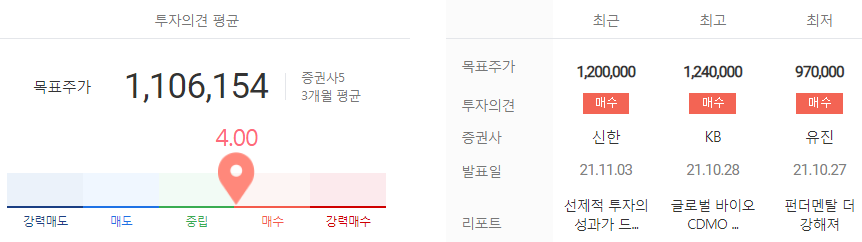 증권사 5개사의 3개월 평균 목표주가는 1,106,154원이며, 투자의견은 매수이다.