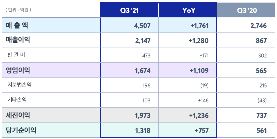 ⓑ 영업이익은 매출 증가 및 3 공장 가동률 상승에 따른 영업레버리지 효과 등으로 전년 동기 대비 1,109억 원 증가하였다.