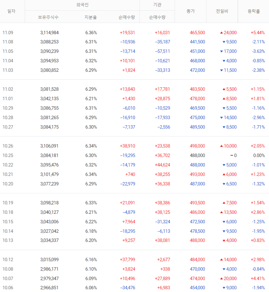 크래프톤은 새로운 스테이트와 IP사업으로 실적이 점점 향상되고 있다. 수급에서도 연기금이 꾸준히 매수하고 있다. 차트에서는 50만 원이 넘어가면 신고가로서 주가의 상방이 열려있다.