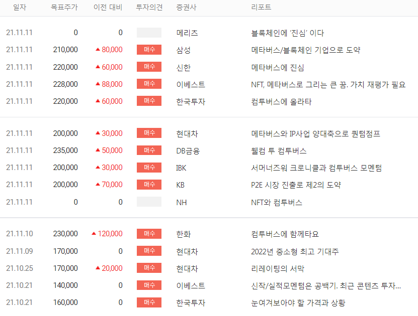 ⓑ 11월 11일 신한증권에서는 목표주가 22만 원, 투자의견 매수를 제시하였으며 예상보다 빠른 NFT활용 게임을 출시하고 메타버스 플랫폼에 주목하자고 하였다.