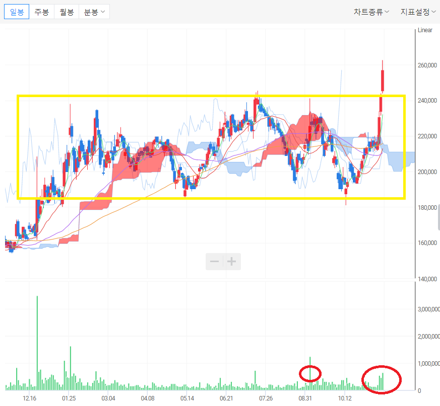 ㄱ) 일봉차트에서 19 ~ 24만원 부분의 박스권을 3일간의 양봉으로 돌파하였다. 거래량도 3일동안 증가하는 것을 볼 수 있다.