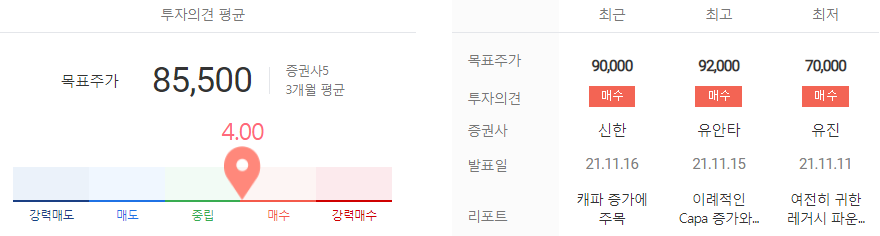 ⓐ 11월 16일 신한증권에서는 목표주가 9만 원, 투자의견 매수이며, 3분기 영업이익이 1,190억 원으로 전분기 대비 46.2% 증가를 기록했으며 2022년 상반기까지 수주 물량을 확보한 것으로 파악했기 때문에 실적이 향상될 것이라고 전망하였다.