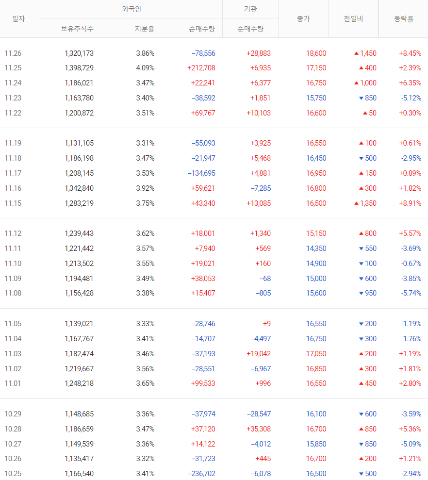 ㄴ) 11월 26일에는 개인 43.3억 원 매수, 외국인 12.9억 원 매도, 기관 5.5억 원 매수하였다. 개인과 기관의 매수하고 있으며 그동안 매수를 하였던 외국인은 매도로 전환된 모습이다.