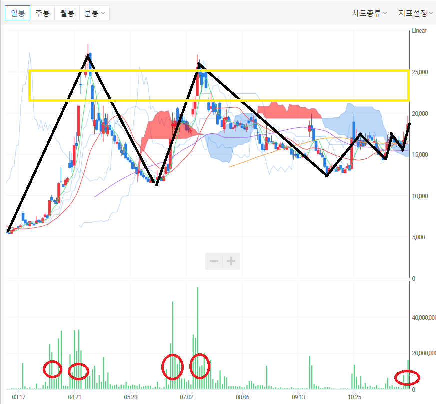 ㄴ) 월봉 차트에서 상승할 때는 대량의 거래량을 동반해서 급등한 후에는 윗꼬리가 달린 봉이 만들어진다. 20월선이 저항이 되어서 20월선까지 내려오면 다시 상승하고 있다.