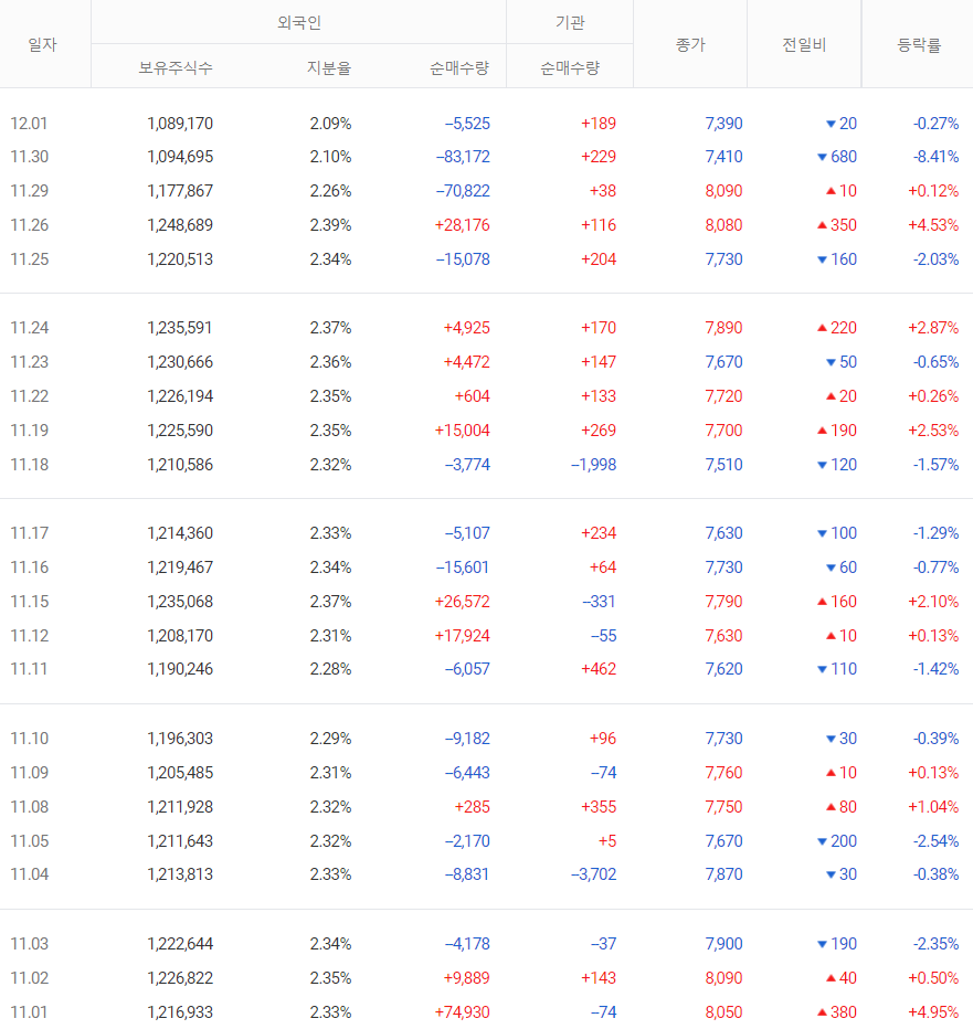 ㄱ) 11월 1일부터 현재까지 개인 6.0억 원 매수, 외국인 7.8억 원 매도, 기관 0.9억 원 매수하고 있다.