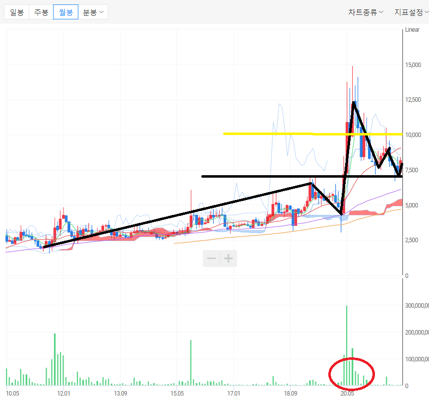 ㄴ) 월봉 차트에서 꾸준히 상승하는 흐름을 보이고 있다. 작년 4월과 5월에 대세 상승이 나온 후 조정을 받았다. 약 7천 원 부근에서 지지를 받고 하락의 흐름을 돌려세워 줄 수 있는 양봉이 나왔다.