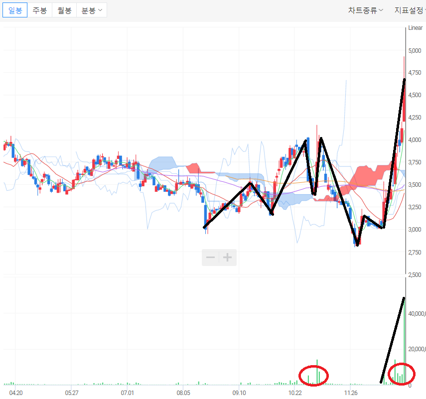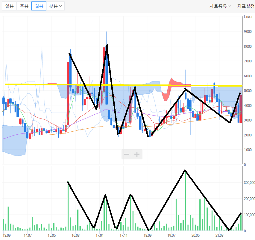 ㄴ) 월봉 차트에서 거래량과 주가의 움직임이 거의 비슷하게 움직인다. 거래량이 많으면 상승하고 거래량이 적으면 하락하거나 조정의 형태이다. 다음 달에도 거래량이 많이 나온다면 충분히 상승할 수 있다는 의미가 된다. 매물대는 5,300원이다. 이 가격대를 넘어선다면 추가 상승할 확률이 높을 것이라고 본다.