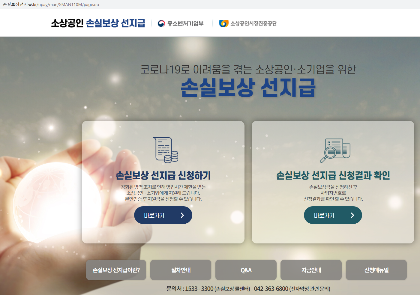 신청 당일 소진공에서 대상자에게 안내 문자를 발송하였으나 문자를 받지 못한 경우에는 "손실보상선지급,kr"에서 신청 및 대상 여부 조회 가능하다.