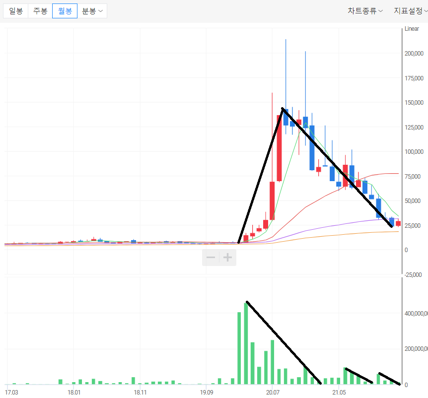 ㄴ) 월봉 차트에서 2020년 3월부터 9월까지 7개월 동안 상승하고 1년 5개월 동안 하락하였다. 거래량도 조저의 모습을 보이고 있다.