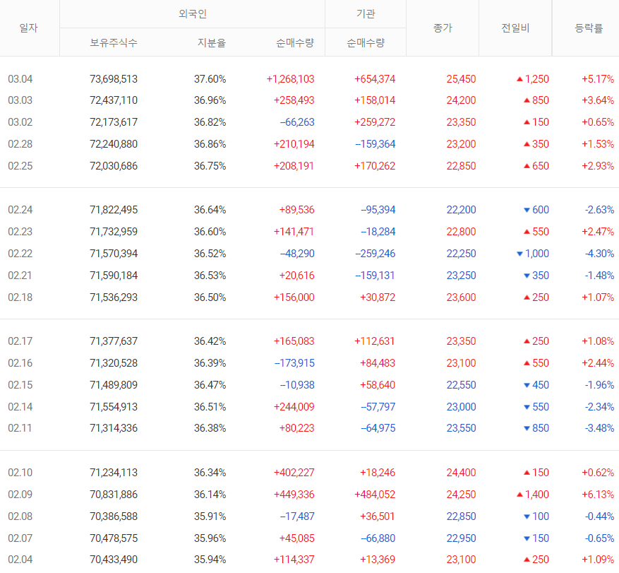 ㄴ) 3월 7일 수급은 개인 396.6억 매도, 외국인 280.4억 매수, 기관 123.8억 매수하였다.