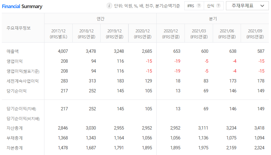 하지만 최근 매출과 영업이익은 감소하는 추세이다.