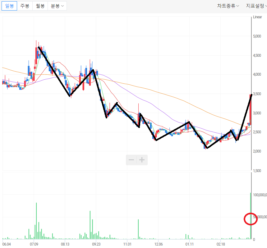 ㄴ) 월봉 차트에서 한 차례의 파동의 끝나고 새로운 파동이 시작되는 것인지는 나중에 할 수 있겠지만, 거래량이 일어나며 좋은 흐름을 보이는 것은 사실이다. 위로 올라갈수록 전고점의 매물들이 출회될 가능성이 높다. 매물대의 돌파 여부가 중요하다.