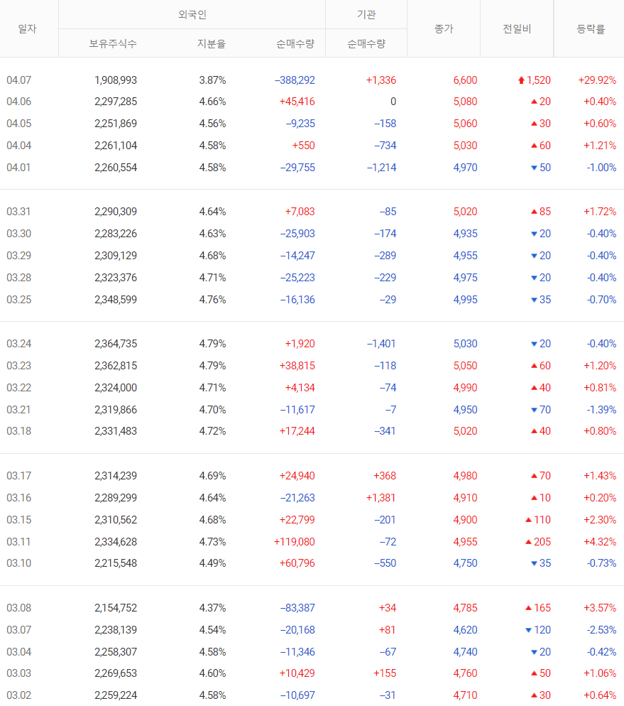 ㄴ) 4월 7일 수급은 개인 24.0억 매수, 외국인 21.6억 매도, 기관 0.08억 매수하였다.