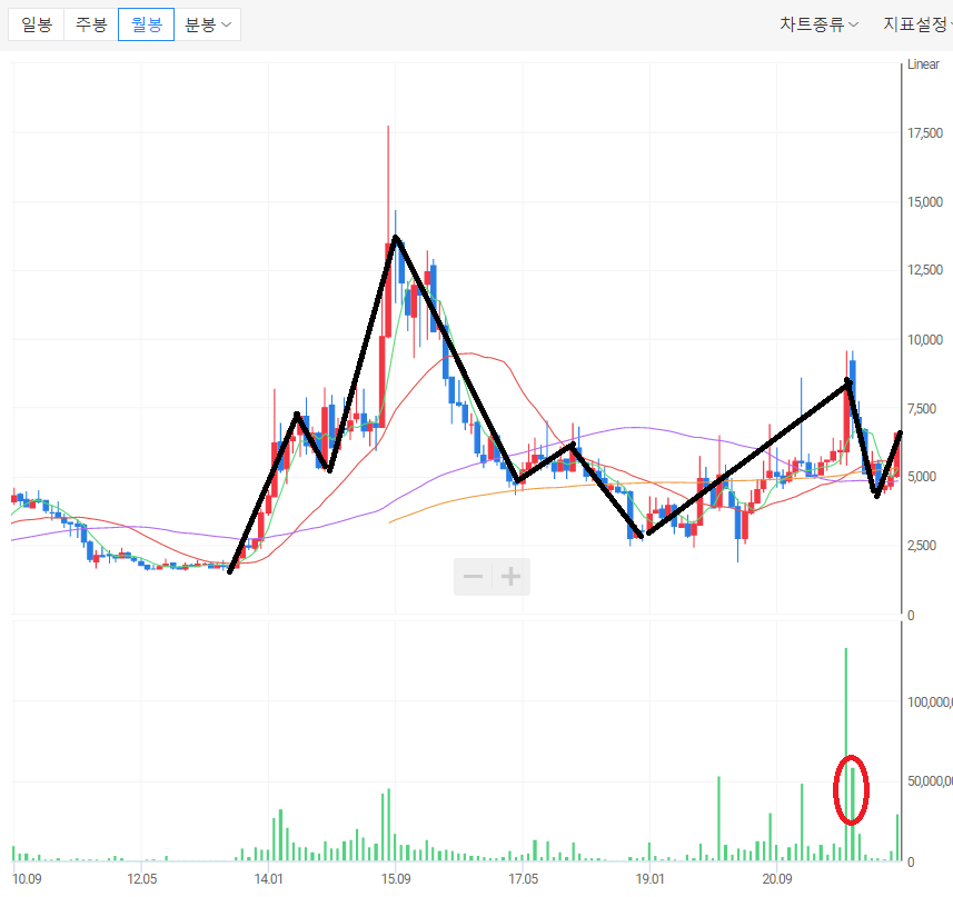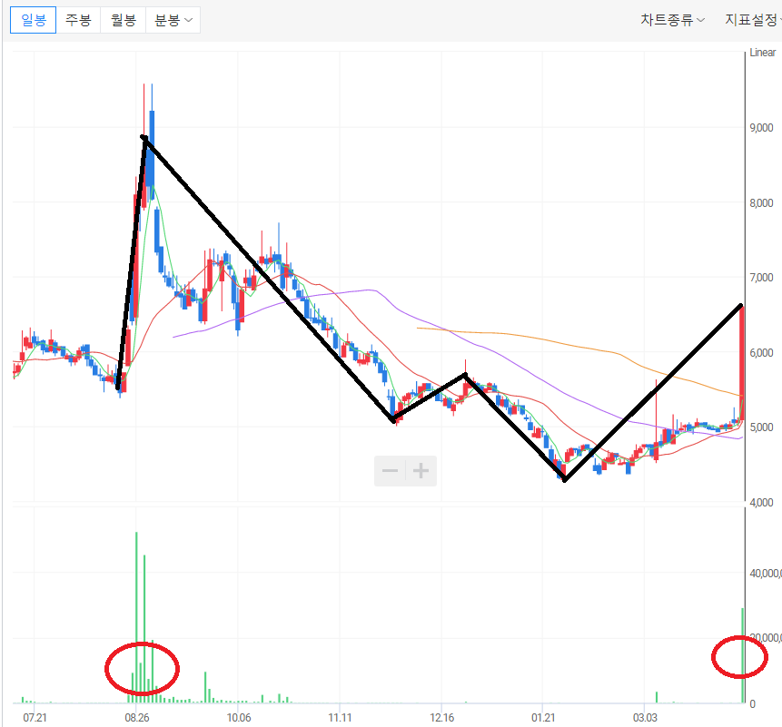 ㄴ) 월봉 차트에서 2015년도에 한차례의 파동이 이미 나와서 매물들이 쌓여 있다. 특히 작년 8월에는 최대 거래량이 실린 양봉과 음봉이 연속으로 나왔다. 이 부분이 세력일 매집한 것인지 아닌지는 지금은 알 수 없지만 지금은 주요 이동평균선들을 가뿐히 돌파하며 상승 중이다.
