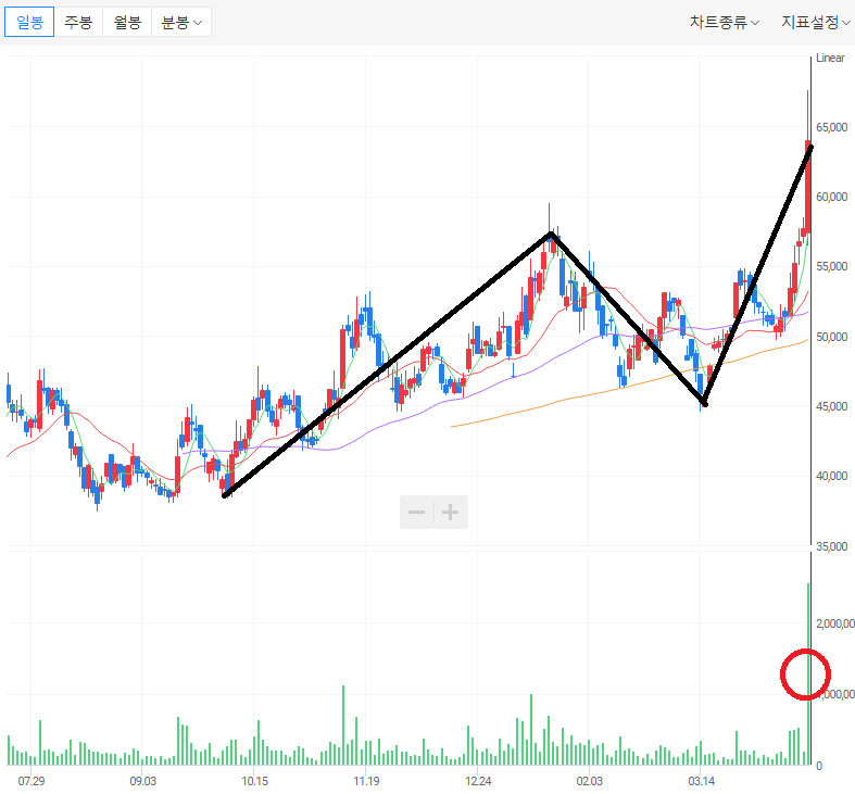 ㄴ) 월봉 차트에서 주가가 약 4년간 횡보하다가 상승하고 조정받고 다시 상승 후 조정받고 상승하는 모습니다. 물량을 소화하고 조금씩 우상향하고 있어서 상승하였을 때 진입을 하게 된다면 주가 조정이 끝나고 상승할 때까지 기다려야 할지도 모른다.