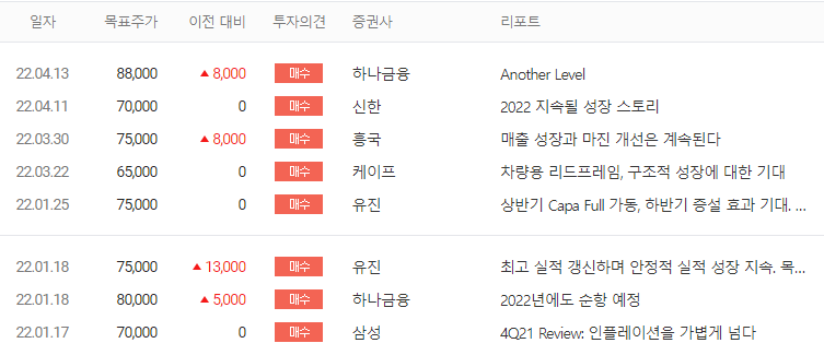 ⓐ 4월 13일 하나금융투자증권에서는 목표주가 88,000원, 투자의견 매수를 제시하였으며, 2022년 1분기 실적은 서프라이즈이며 거침없는 실적에 상응하는 주가를 기대한다고 전망하였다.