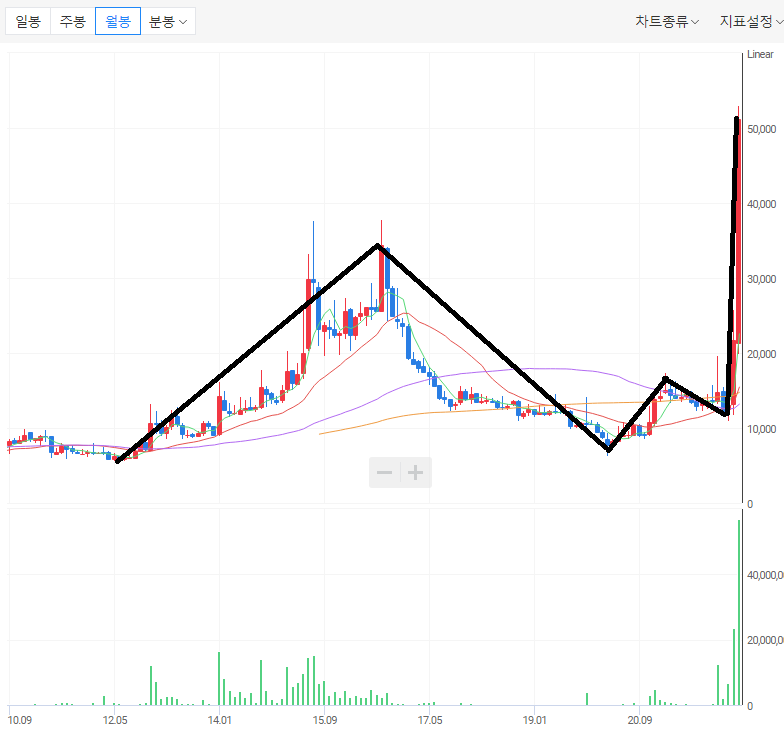 ㄴ) 월봉 차트에서 전고점을 뚫고 상승하는 흐름이다.