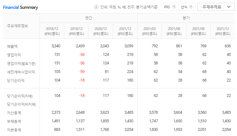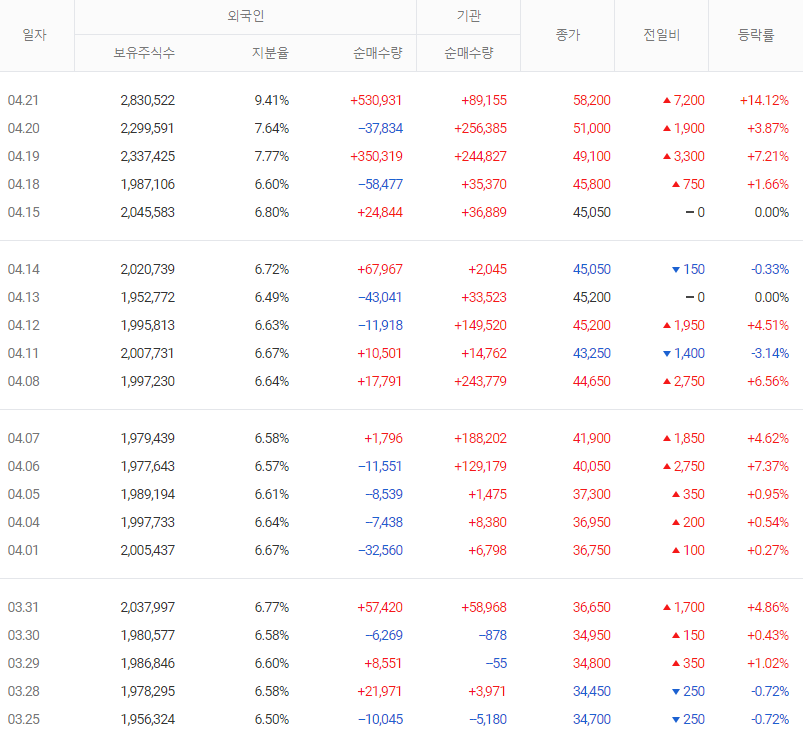 ⓐ 4월 21일 미래에셋 투자증권에서는 목표주가 7.3만 원, 투자의견 매수를 제시하였으며, 2022년 1분기 매출액 907억 원, 영업이익 83억 원을 기록할 것이며 후발 주자이지만 중장기 방향성은 동일하다고 전망하였다.