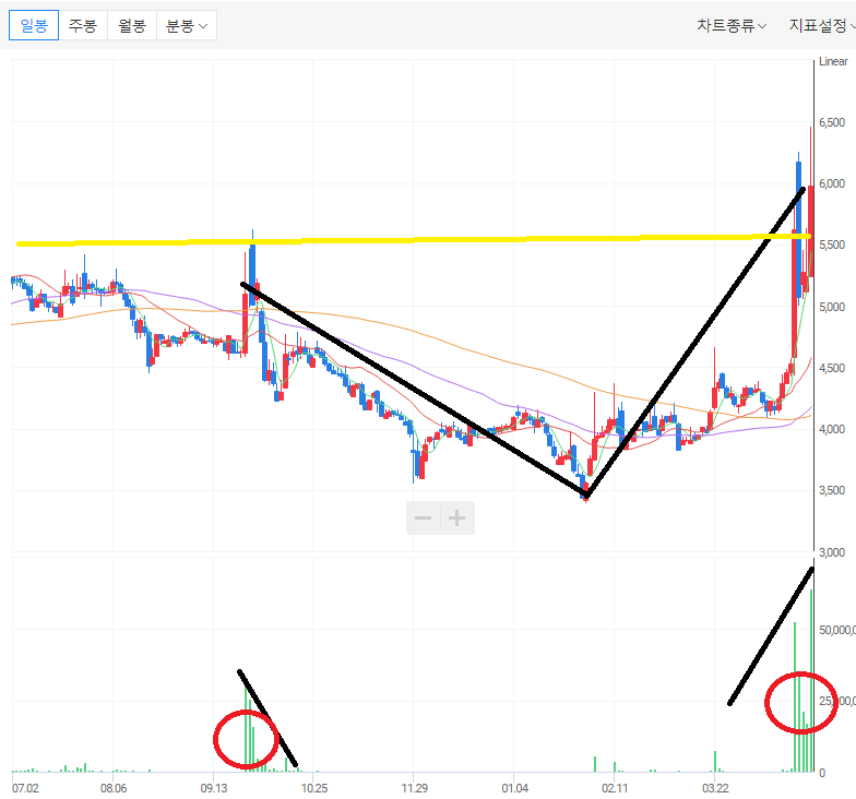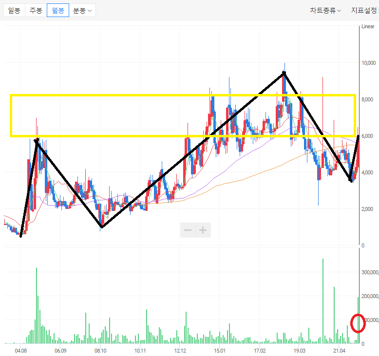 ㄴ) 월봉 차트에서 주요 이동평균선들을 돌파하며 상승하고는 있지만 위에 있는 매물대가 견고하기 때문에 강하게 돌파하지 않으면 다시 반락할 확률이 높아 보인다.