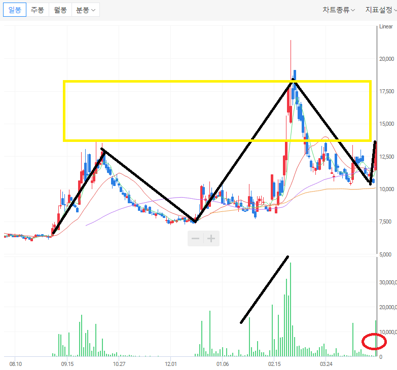 ㄱ) 일봉 차트에서 상승과 하락의 폭이 큰 급등주의 패턴으로 움직이고 있으며 지금은 상승 구간에 있다. ㄴ) 월봉 차트에서 신고가를 가기 위해서는 지난 2월의 거래량보다 더 많은 거래량이 필요하다. 4월의 봉은 3월의 음봉을 감싸는 양봉이 나올 가능성이 많다. 다만 윗꼬리가 길게 달리는 것을 조심해야 한다.
