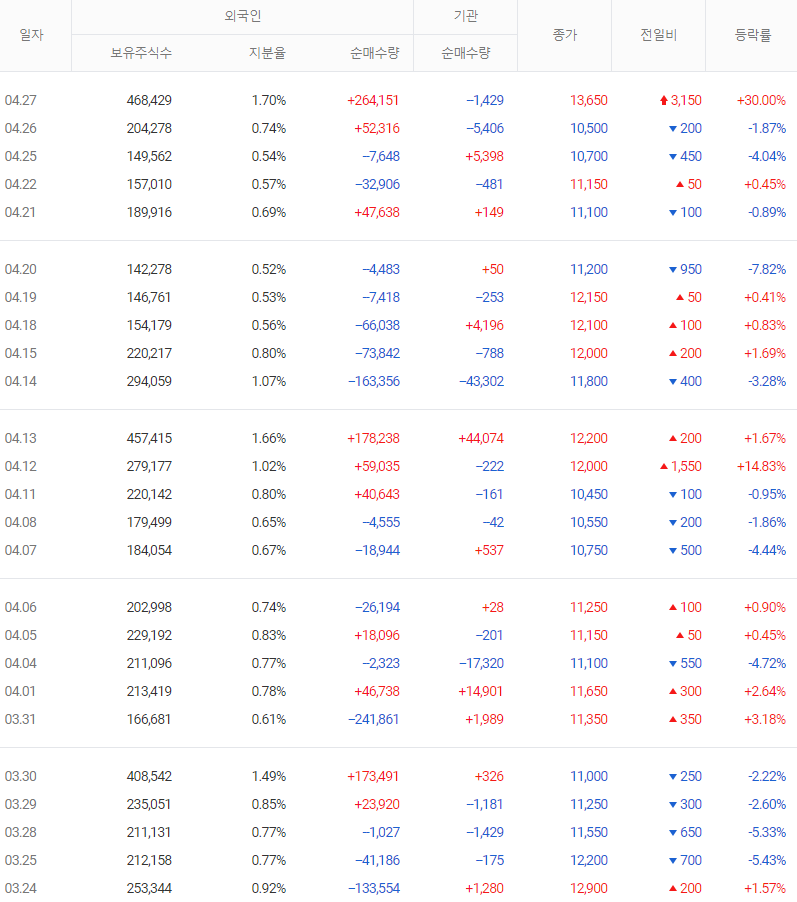 ㄴ) 4월 27일 투자자별 수급은 개인 33.7억 매도, 외국인 36.0억 매수, 기관 0.1억 매도하였다.