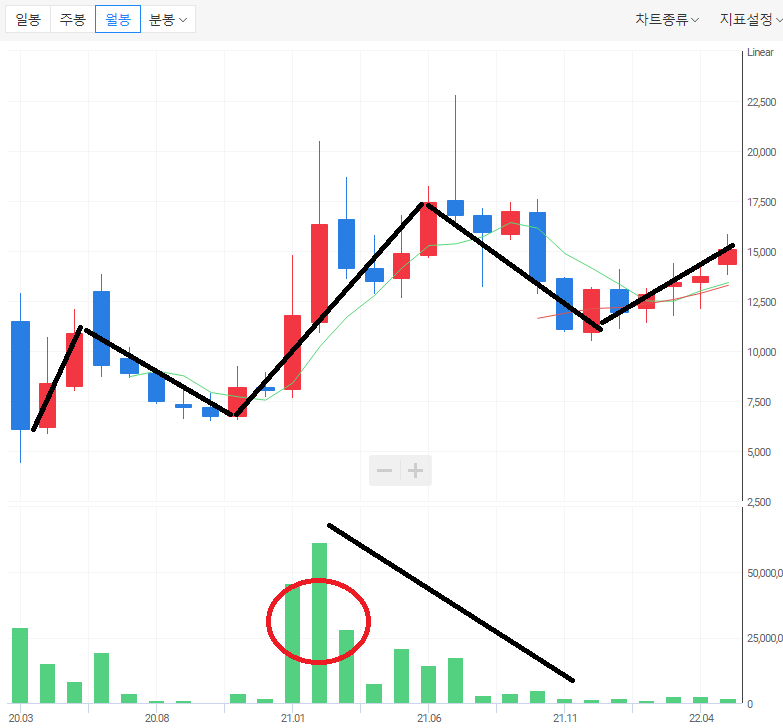 ㄴ) 월봉 차트에서 상장 이후에 점진적으로 상승 후 조정 상승 후 조정을 받으면서 주가는 우상향하고 있다.