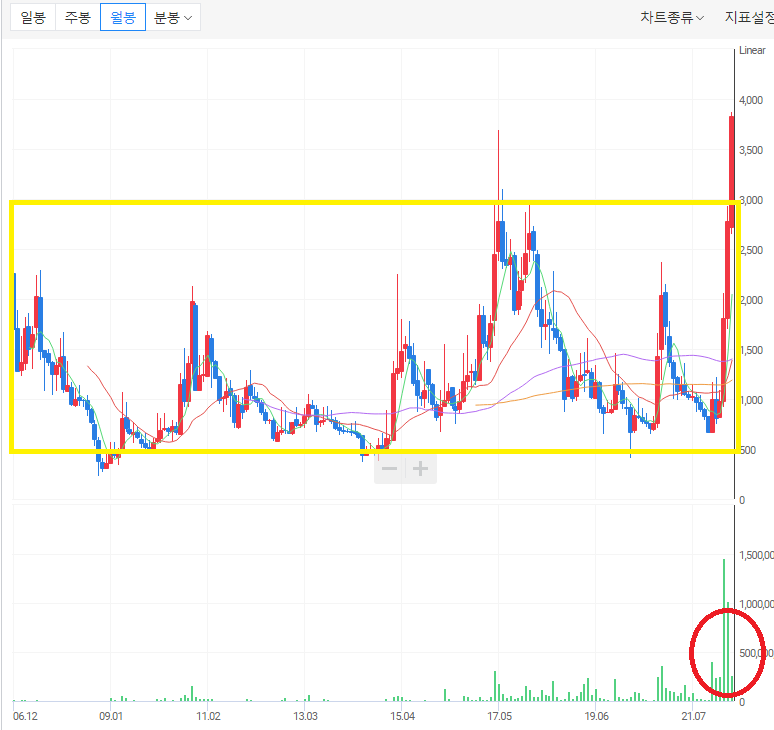 ㄴ) 월봉 차트에서 15년 넘게 유지해오던 박스권을 이탈하며 상승하고 있다. 최근 3개월간 빨간 양봉으로 강한 상승세라는 것을 나타내 주고 있다.