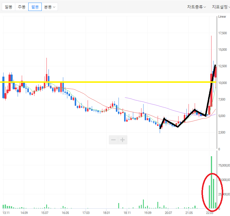 ㄴ) 월봉 차트에서 상장 이후에 꾸준히 하락하다가 바닥에서 횡보하고 대규모의 거래량을 동반하며 슈팅이 나왔다. 6월에는 거래량이 더 많이 나온다면 상승을 이어갈 수 있을 것이라고 본다.