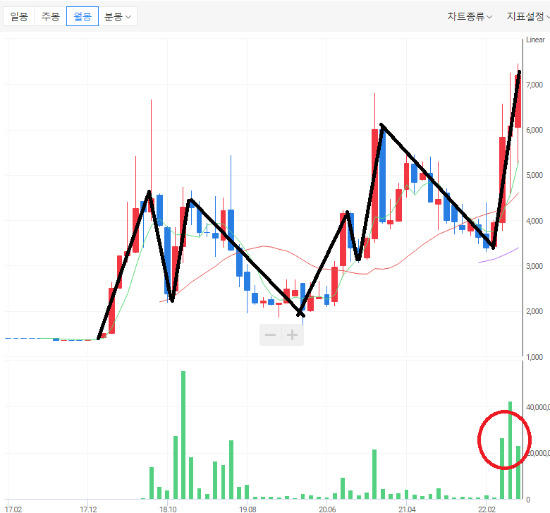 ㄴ) 월봉 차트에서 새로운 파동이 생성되어 상승으로 전개되는 흐름이다.