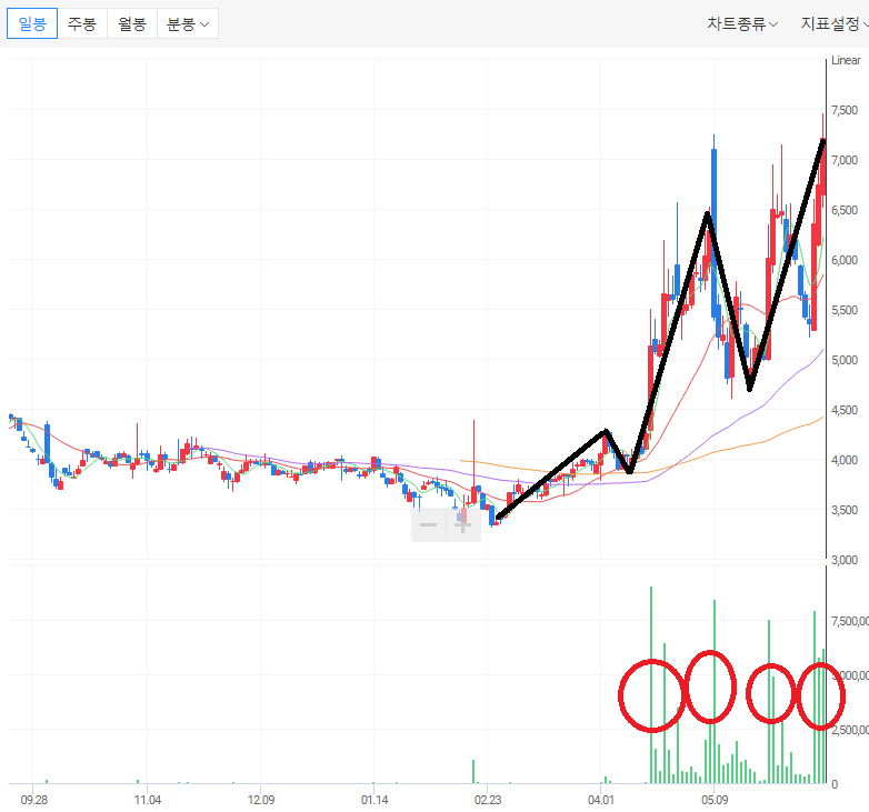 ㄱ) 일봉 차트에서 대량의 거래량들과 함께 신고가를 기록하고 있다. 주가는 레벨-업이 되는 양상이다.