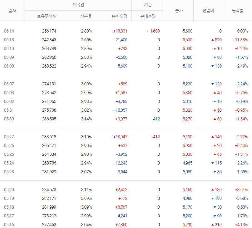 ㄴ) 6월 15일 수급은 개인 6.5억 매수, 외국인 3.5억 매수, 기관 2.1억 매도하였다.