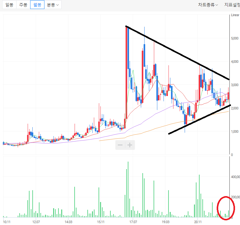 ㄴ) 월봉 차트에서 2017년에 대시세가 나온 뒤로 깃발 형태 패턴의 위, 아래로 움직이고 있다. 상승으로 가기 위해서는 거래량이 더 필요하다.