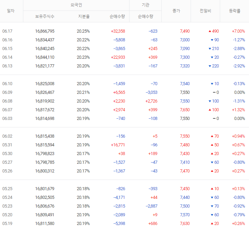 ㄱ) 5월 1일부터 6월 17일까지 투자자별 누적 순매수는 개인 4.6억 매도, 외국인 4.6억 매수, 기관 0.06억 매도하였다.